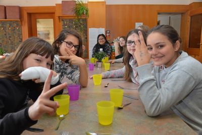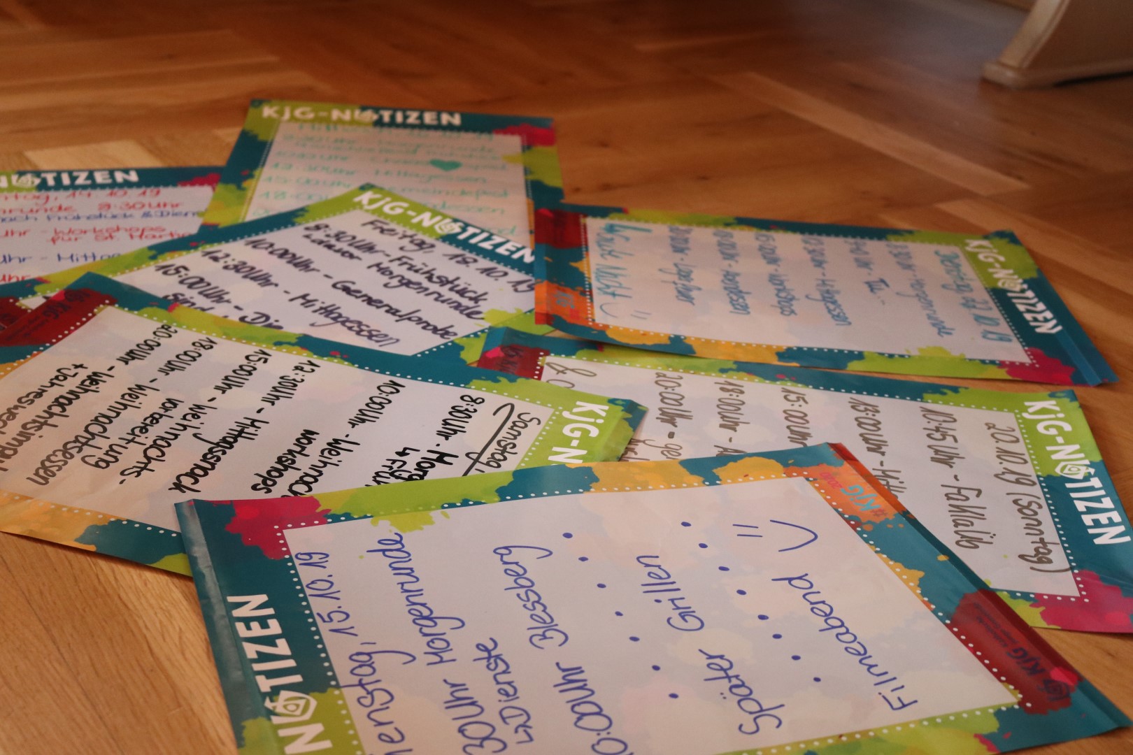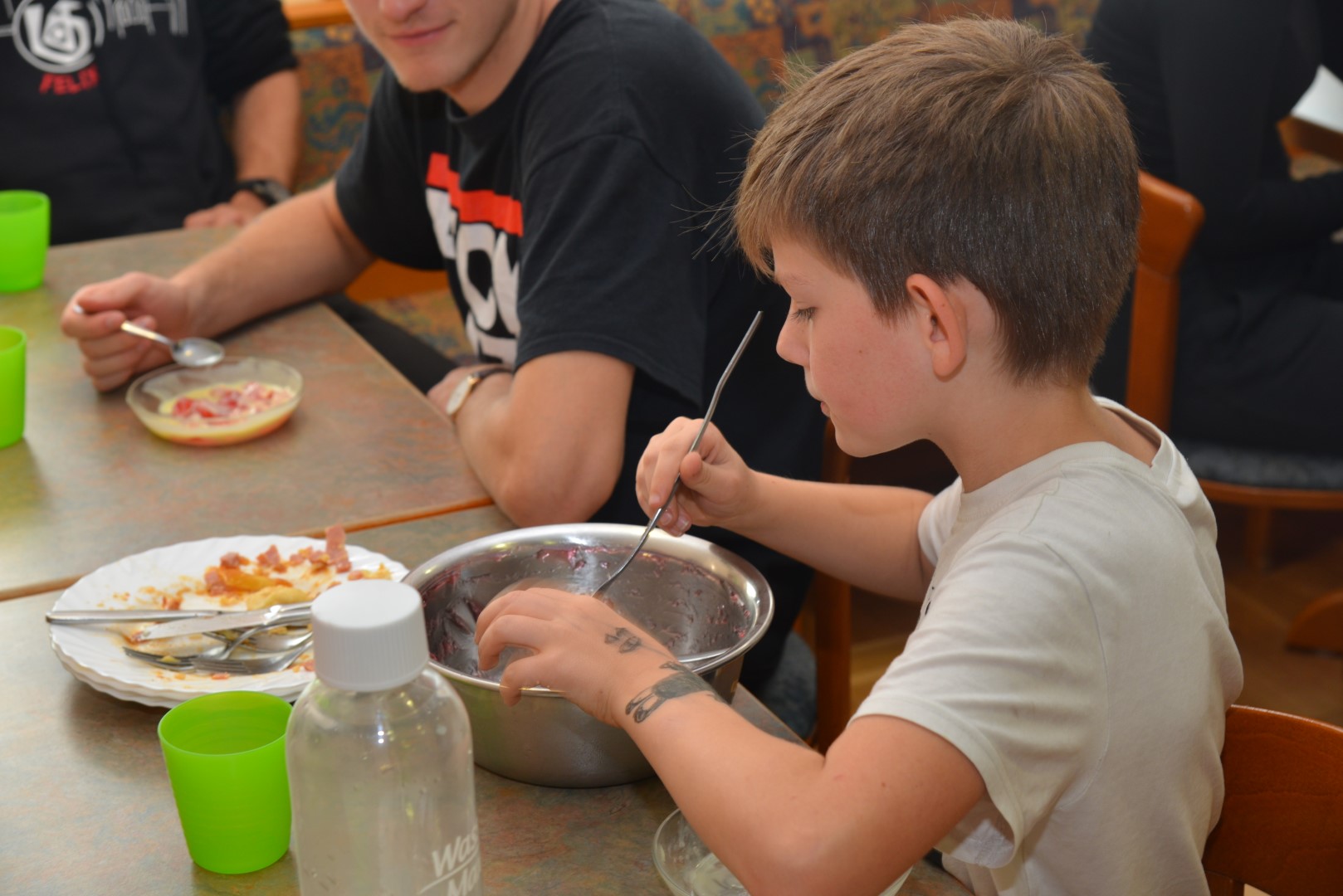Wir hatten eine normale Morgenrunde und danach frühstückten wir. Nach dem Frühstück hatten wir als ersten Programmpunkt das Ausdenken und Erproben von Theaterstücken in unseren Tischgruppen. Die Theaterstücke sollten das schönste Lagererlebnis der Kinder auffassen und am Abend vorgeführt werden.