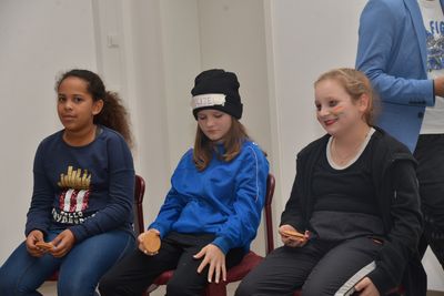 Dann gab es drei Themen. Werwölfe, Vampire und Hexen. In diesen Gruppen hatten wir jeweils drei Begriffe, die auf jeden Fall in unserem Theaterstück vorkommen mussten. Dafür hatten wir bis zum Mittagessen Zeit. Zum Mittag gab es Malzbier, da heute Oktober ist und es perfekt zum Oktoberfest passt. Dazu gab es Fischstäbchen, Kartoffelpüree und Spinat. Mmmmmmmmhhhhmmmm