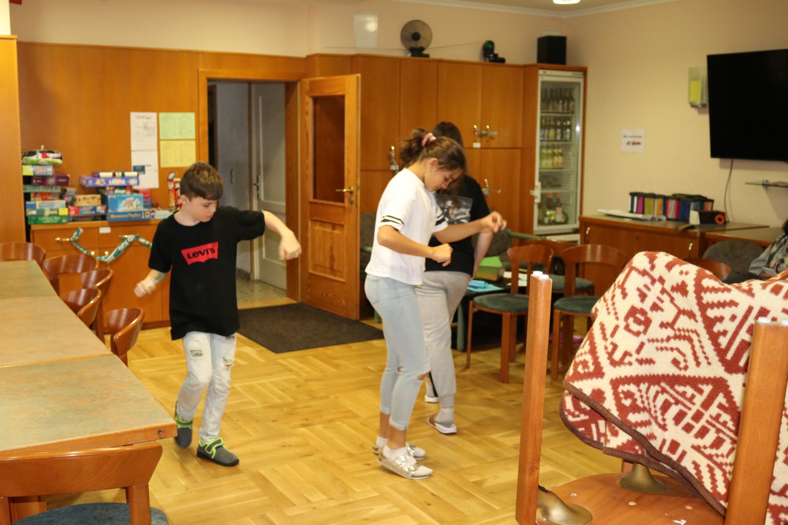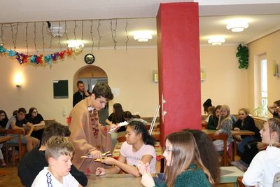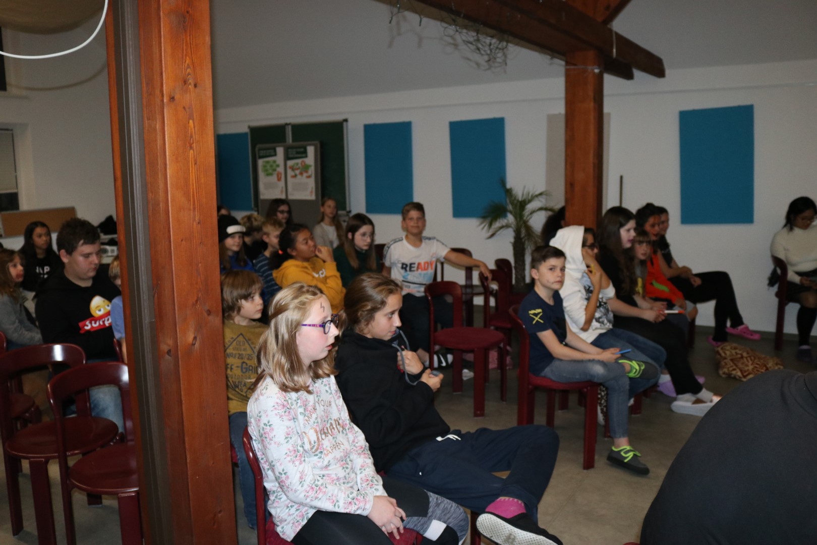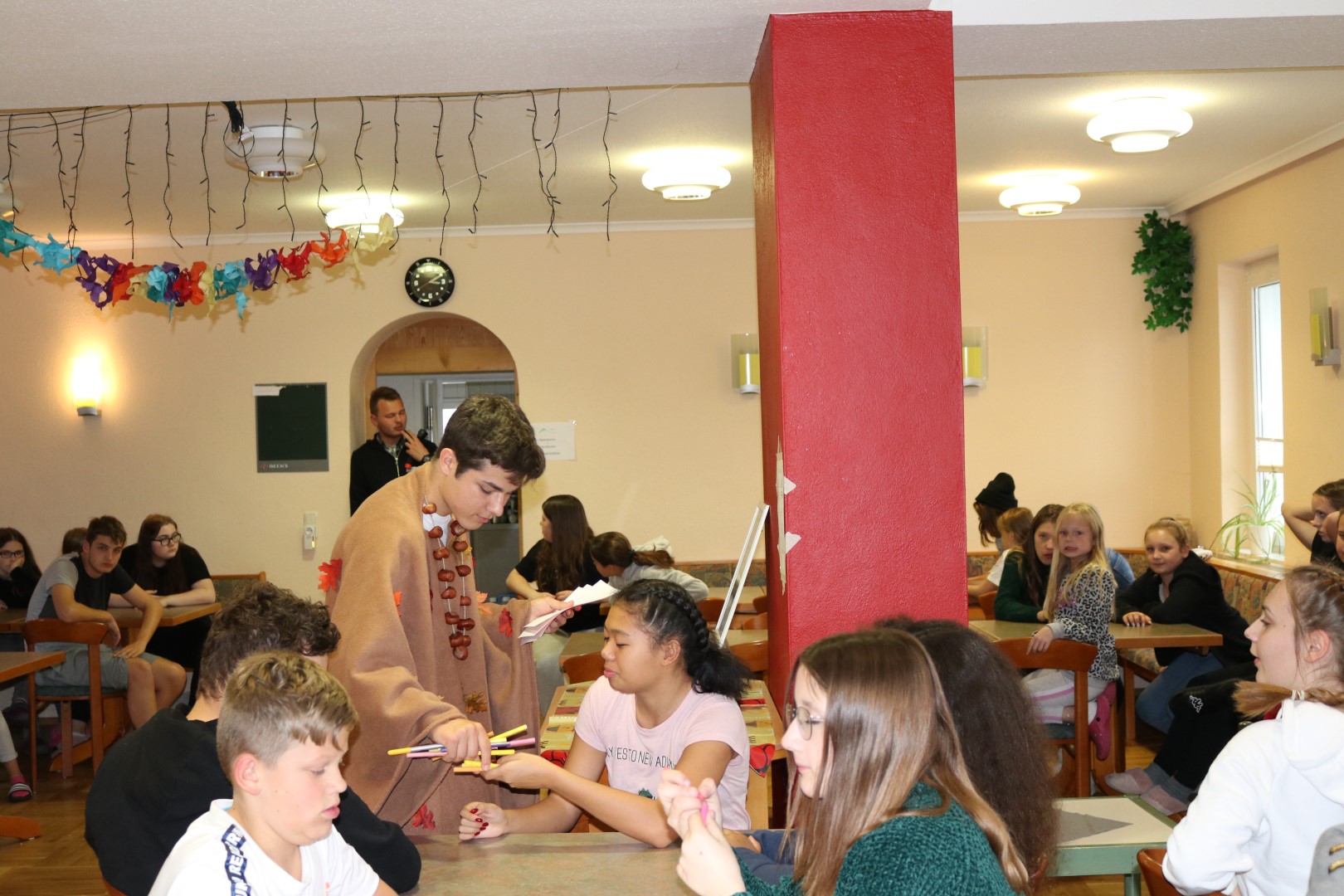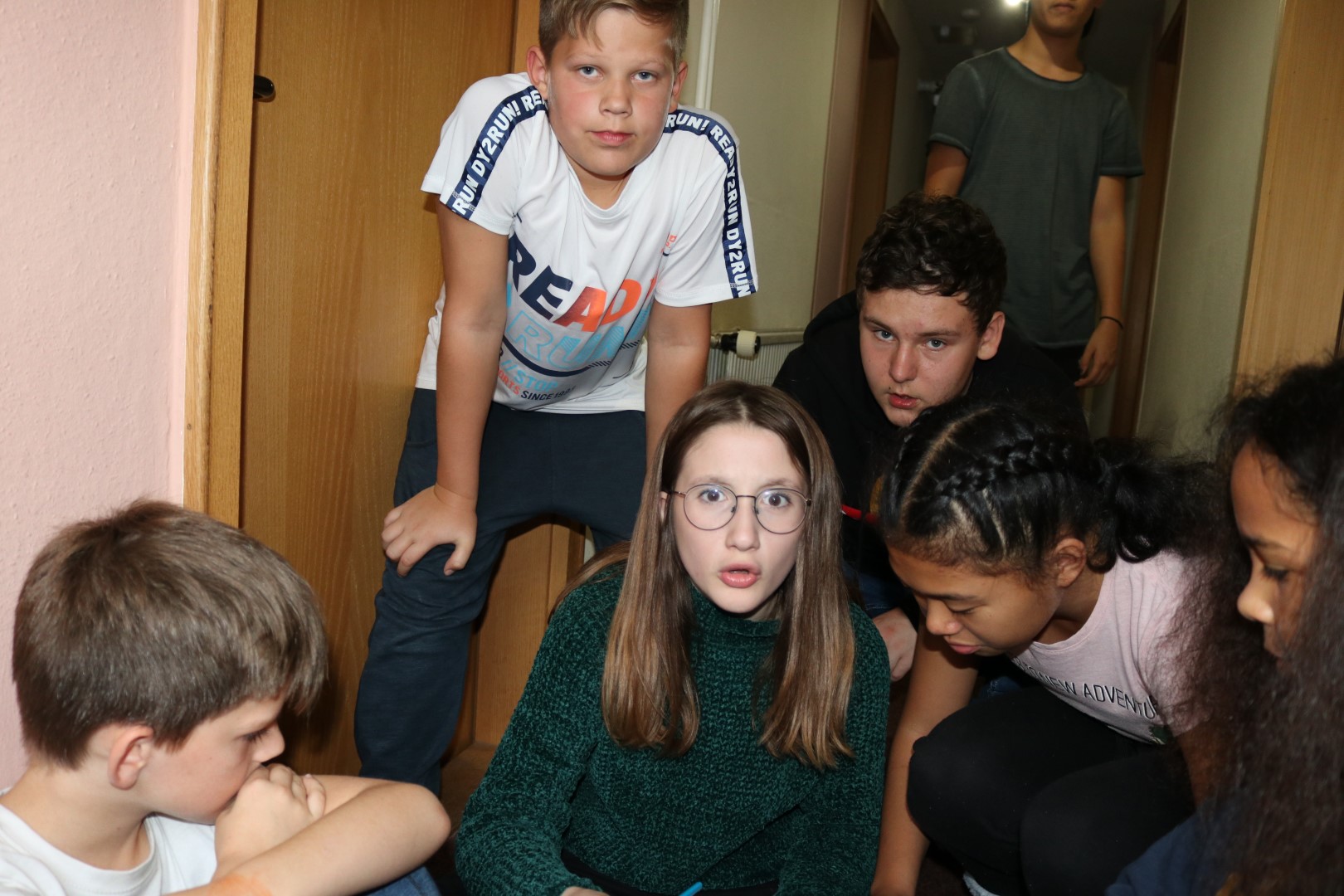 Nach dem Mittagessen hatte der Kiosk eröffnet und wir konnten die Pause mit den Brettspielen voll ausnutzen. Nach der Mittagspause starteten wir in ein Rollenspiel, indem sie Rätsel gelöst hatten, um die zuvor entflohenen Halloweengeister einzufangen. Dazu mussten sie von verschiedenen Personen Gegenstände sammeln, um den Pförtner zu überzeigen das Rudel zum Zaubereiminister vorzulassen.