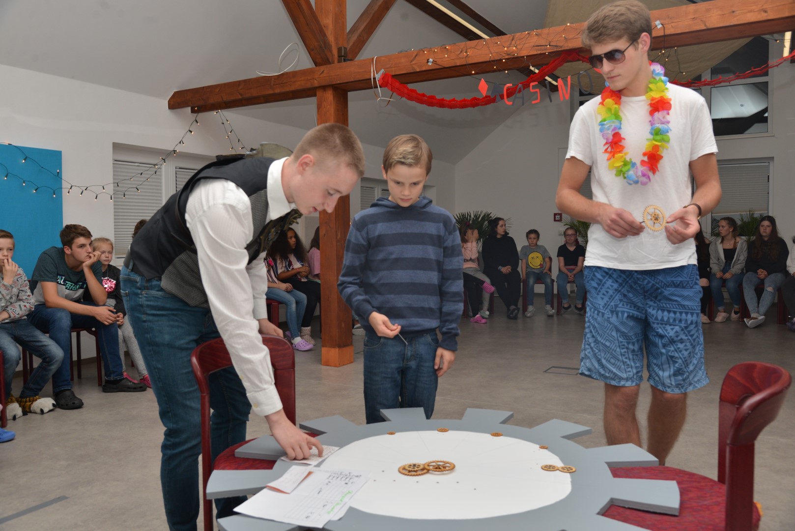 Und am Nachmittag ging es wegen des nicht ganz sommerlichen Wetters drinnen weiter, denn dort feierten wir unser Gemeindefest nach. Es gab verschiedene Spielstationen, an denen fleißig Punkte gesammelt werden konnten. Nach einer Runde Singstar gab es Abendbrot zur Stärkung für den Casinoabend.